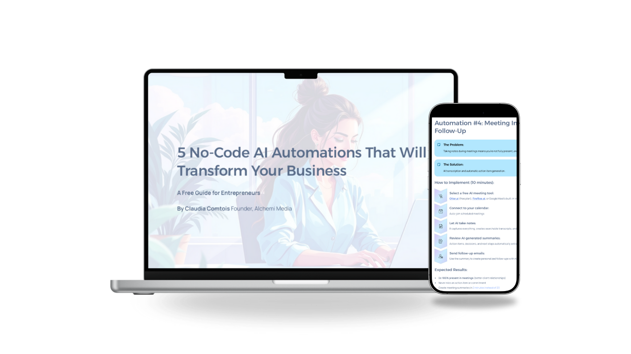 In this guide, I'm sharing 5 powerful AI automations you can implement TODAY. No coding. No tech degree. No overwhelm. Just practical solutions that will save you hours every week while helping you increase productivity, boost creativity, lower costs, and drive more sales.